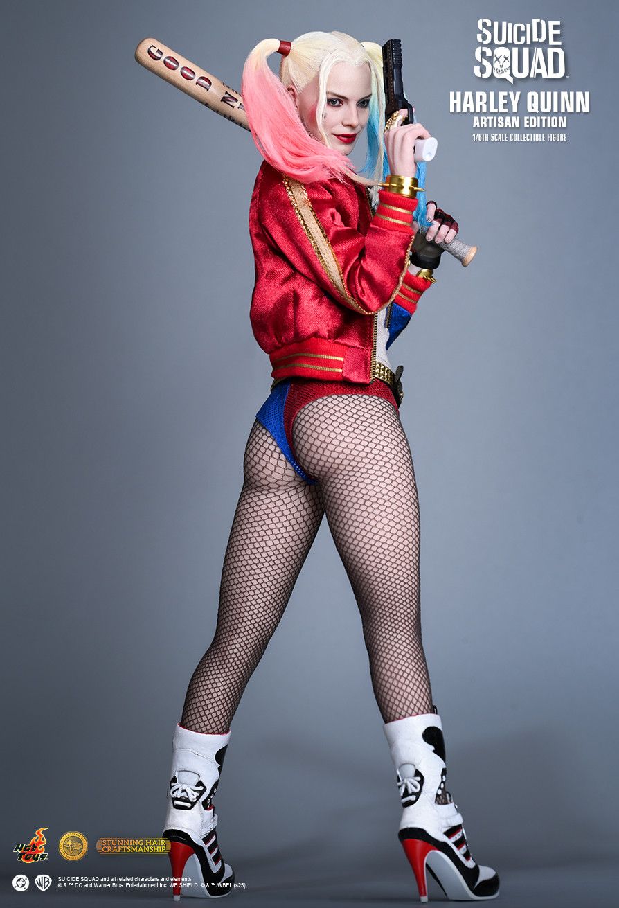 This collectible figure features a screen-accurate head sculpt with separate rolling eyeballs. The Artisan Edition features meticulously implanted blonde hair with blue and pink colored pigtails made of wool material, elevating the figure's realism. The newly developed body, made from silicone material, features a seamless design throughout and a specialized metal armature inside that allows for a wide range of articulation. Its body shape beautifully enhances the character’s feminine curves, and it's intricately detailed with tattoos. Harley Quinn’s costume is a masterful replica, featuring her finely tailored T-shirt, baseball jacket, holster strap, hot pants and fishnet tights. Her high heels, belt, choker, and bracelets are recreated with meticulous detail, capturing the character’s iconic look from the film. Her weaponry includes a baseball bat, a mallet, and a revolver pistol with two speed loaders. The set includes a heart and a sword, allowing fans to recreate the scene in which Harley Quinn uses the Soultaker Sword to cut out Enchantress’s heart. It also comes with a handbag and a figure base with glass shard details, allowing fans to recreate the scene where Harley breaks the glass window of a storefront display to steal a purse.