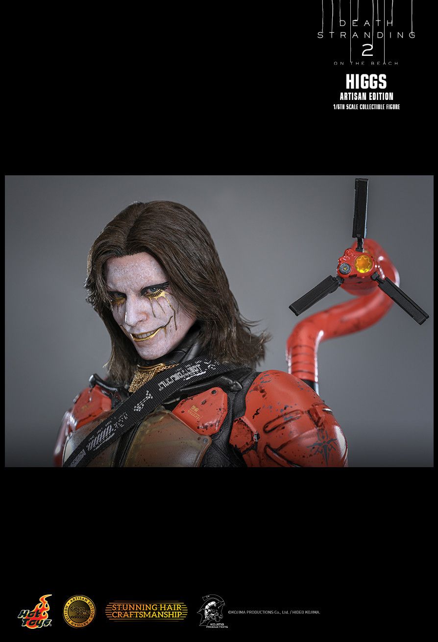 Higgs’s menacing appearance is recreated in a black suit layered beneath finely built orange armor, including arms, back, thighs, translucent chest and abdomen plating, and exoskeleton. Completing his look are a gold necklace, boots, and an Artisan Edition Deluxe Version exclusive red cloak with a magnetic fastening feature, allowing for a dynamic display. Equipped for both spectacle and destruction, Higgs wields his pistol and Battle Guitar, along with an Artisan Edition Deluxe Version exclusive gold colored double-neck Battle Guitar that can be separated into deadly dual blades. Additional accessories include a red mask, Odradek attachable to his back armor, a guitar strap, and a gut tube that connects the guitar to his waist. Collectors will also find a Dog Mine accessory and a coffin-on-tar diorama base that can be mounted on the specially designed figure stand, both exclusive to the Deluxe Version and Artisan Edition Deluxe Version, providing the perfect stage to recreate Higgs’s unforgettable entrance.