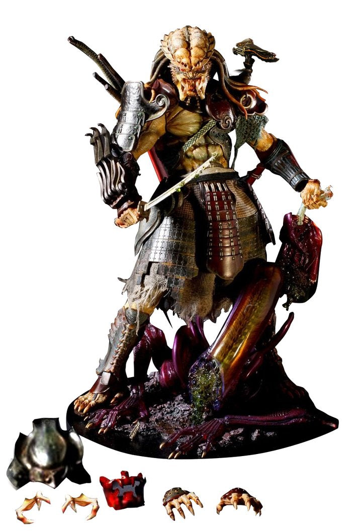 SPECIAL FEATURES SAMURAI PREDATOR IN WARRIOR LOOK, NEWLY SCULPTED HEAD AND BODY WITH ARTICULATIONS, DETAILED ACCESSORIES, WEAPONRY AND DIORAMA BASE OF ALIEN’S CORPSE